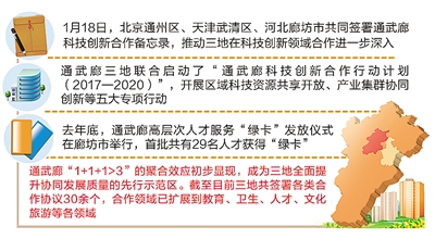 強化區域科技合作,力促三地經濟實現高質量發展,通武廊三地聯合啟動了“通武廊科技創新合作行動計劃(2017—2020)”,通過開展區域科技資源共享開放、產業集群協同創新、聯合構建人才高地、科技金融合作、自主知識產權促進等五大專項行動,力爭全面提升三地整體自主創新能力,使區域科技創新合作機制更加完備,地區科技創新實力顯著提高。