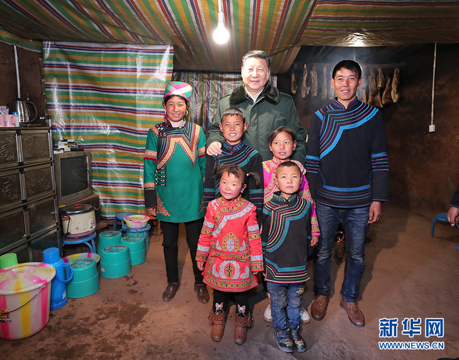2月11日,中共中央總書記、國家主席、中央軍委主席習近平在四川考察。這是習近平在涼山彝族自治州昭覺縣三岔河鄉三河村同貧困戶吉好也求一家合影。新華社記者 謝環馳 攝