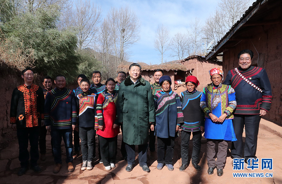 2月11日,中共中央總書記、國家主席、中央軍委主席習近平在四川考察。這是習近平在涼山彝族自治州昭覺縣三岔河鄉三河村貧困戶節列俄阿木家同鄉親們合影。新華社記者 謝環馳 攝