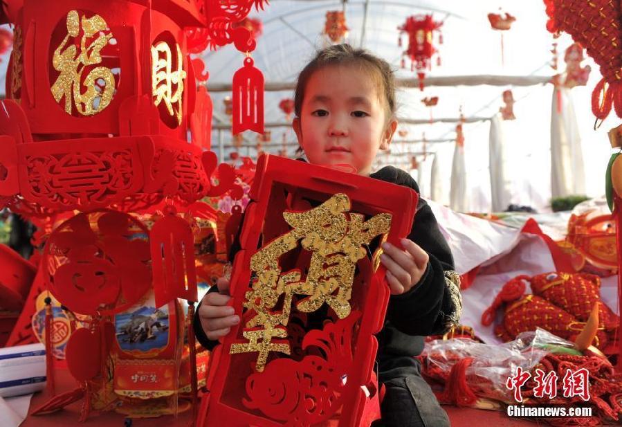 2月12日,臘月二十七,河北雄安新區即將迎來設立之后的首個春節。雄安三縣街頭的民眾們買年貨、掛燈籠、逛花市熱鬧非凡。圖為購買燈籠的孩子。 中新社記者 韓冰 攝