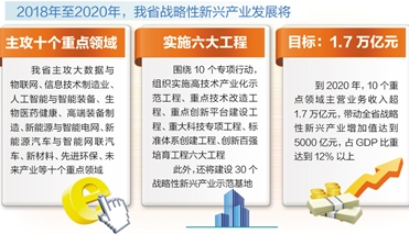 “到2020年,大數據與物聯網、生物醫藥健康等10個重點領域主營業務收入超1.7萬億元,帶動全省戰略性新興產業增加值達到5000億元,占GDP比重達到12%以上。”計劃明確,今后3年,我省戰略性新興產業規模要實現新跨越,成為國民經濟的重要支柱產業;企業競爭力得到新提升,新增一批具有較強創新能力、市場競爭力的行業排頭兵企業;創新能力取得新突破,在關鍵領域取得一批重大科技成果和技術標準;集聚發展形成新格局,培育一批規模超千億元的產業集群,與京津、雄安新區共同形成功能互補、資源共享、產業鏈銜接的國際化戰略性新興產業發展新高地。