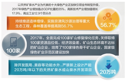 日前,承德礦泉水文化博物館正式落成,一件件實物、一幅幅圖片生動講述著人類保護水、開發水、發展水的歷程。這座國內唯一非企業性質運營的礦泉水文化博物館,加上之前建成的中國高鍶康養礦泉水院士專家工作站、中國高鍶康養礦泉水研究院等,將為承德建設“中國高鍶礦泉城”提供強力支撐。目前,以天然礦泉水產業為代表的十大綠色產業正加快引領全市轉型升級,2017年綠色產業增加值占GDP比重的35%,高新技術產業增加值增長17.9%,高出工業12.9個百分點。