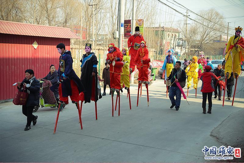 2月21日,大年初六,雄安新區處處洋溢著濃郁的節日氣氛,安新縣趙北口民間老會高蹺會、少林老會、五虎會等齊上陣,帶來了一場別具一格的文化盛宴。圖為趙北口高蹺會正走街串巷進行街頭表演。 劉東堯/圖 劉琪/文