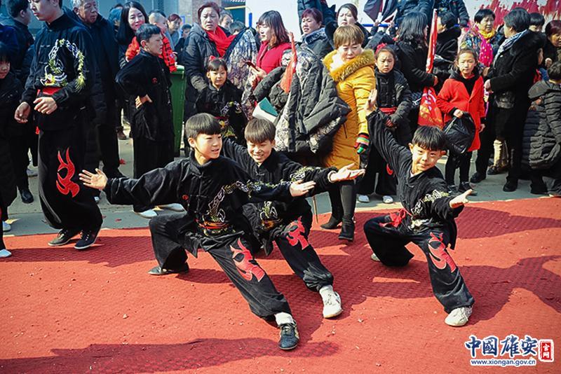 趙北口少林老會上,小演員孫子凱(前排左一)、李佳澤(前排中)、尚韻濤(前排右一)三人齊亮相。 劉東堯/圖 劉琪/文