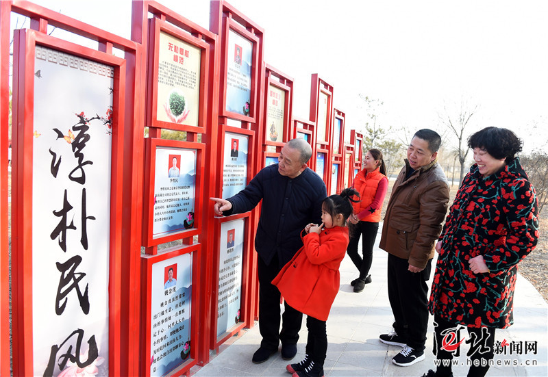 2月20日,游客在雄安新區雄縣昝東村黨建主題公園“淳樸民風”展示牌前參觀。
