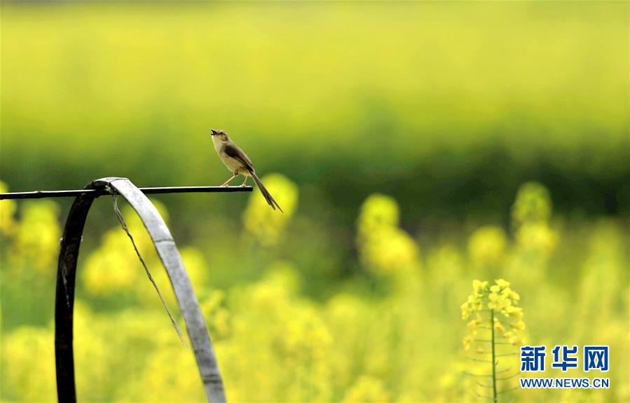 3月3日,一只小鳥在貴州省從江縣的油菜花田中停留。