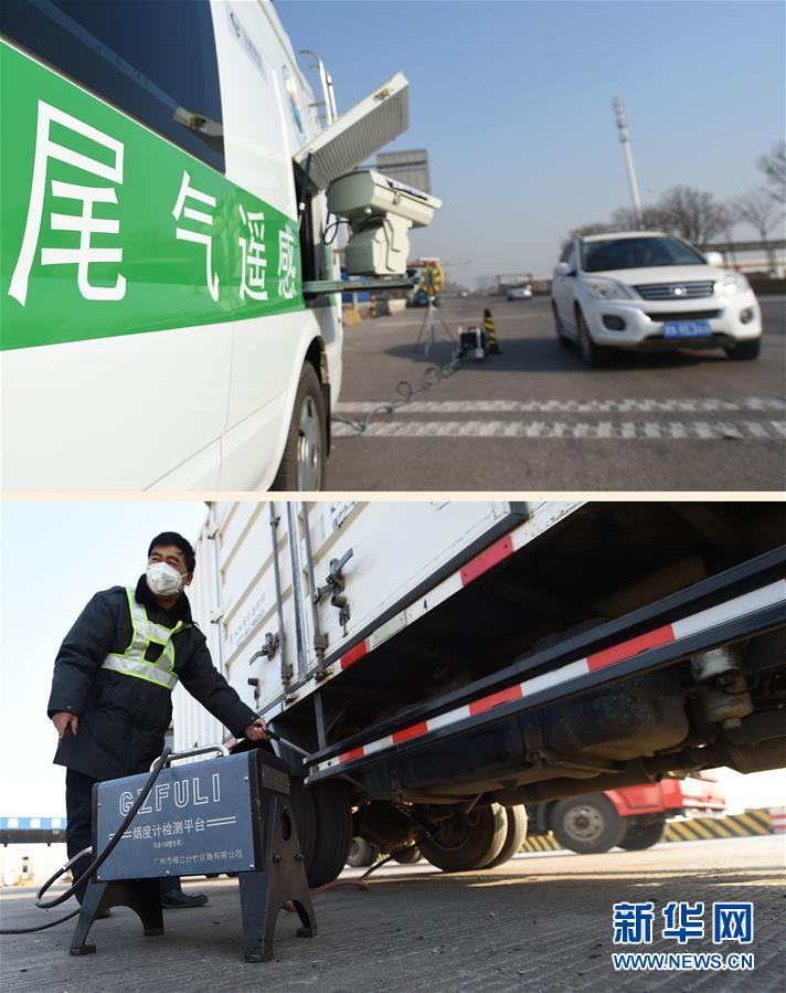 上圖:天津寧河區環保局的機動車尾氣遙感監測車在路邊監測汽車尾氣;下圖:天津寧河區環保局工作人員在路邊人工監測汽車尾氣(拼版照片,2017年12月13日攝)。新華社記者 岳月偉 攝