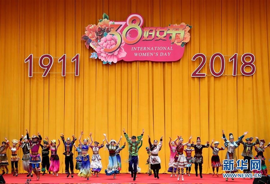3月7日,演員們在招待會上表演集體舞《同心共筑中國夢》。 當日,紀念“三八”國際婦女節(jié)中外婦女招待會在北京隆重舉行。 新華社記者 張玉薇 攝