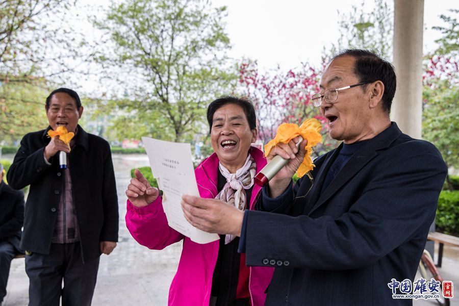 4月13日上午,容城縣新容文化廣場(chǎng)上,細(xì)雨中,涼亭內(nèi),幾位老人正在聲情并茂地演唱。?圖/王永康 文/石萍婷