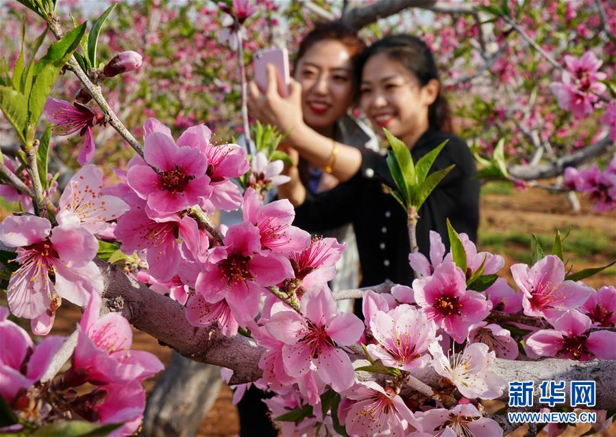 4月27日,游客在北戴河區(qū)費(fèi)石莊村盛開的桃花前拍照。近日,河北省秦皇島市北戴河區(qū)聯(lián)峰山腳下費(fèi)石莊村附近的桃花競(jìng)相綻放,吸引眾多游客前來踏青賞花。 新華社記者 楊世堯攝