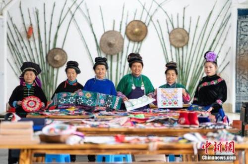 資料圖:貴州丹寨,繡娘在合作社展示完成的刺繡作品。2018年,丹寨縣非遺手工經(jīng)濟(jì)模式共帶動(dòng)全縣近8000名繡娘居家就業(yè),脫貧增收。中新社記者 賀俊怡 攝