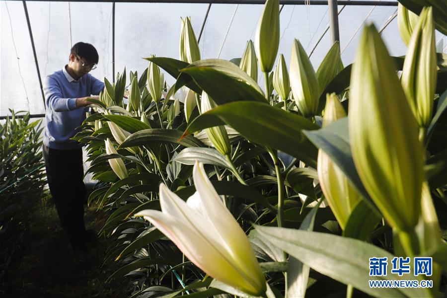1月17日,河北省遵化市興旺寨鄉(xiāng)何家峪村農(nóng)民在大棚內(nèi)管護(hù)百合花。春節(jié)臨近,各地花卉種植大棚、花卉銷售市場內(nèi)一片姹紫嫣紅,洋溢著濃濃的年味。新華社發(fā)(劉滿倉 攝)