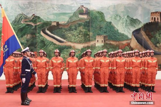 資料圖:國家綜合性消防救援隊伍授旗儀式。中新社記者 盛佳鵬 攝