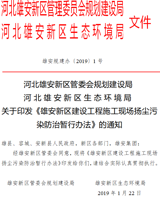 近日,雄安新區規劃建設局、生態環境局聯合印發《雄安新區建設工程施工現場揚塵污染防治暫行辦法》,實施最嚴厲的施工現場揚塵防治措施,嚴重違規的參加單位將清出雄安新區建設市場。