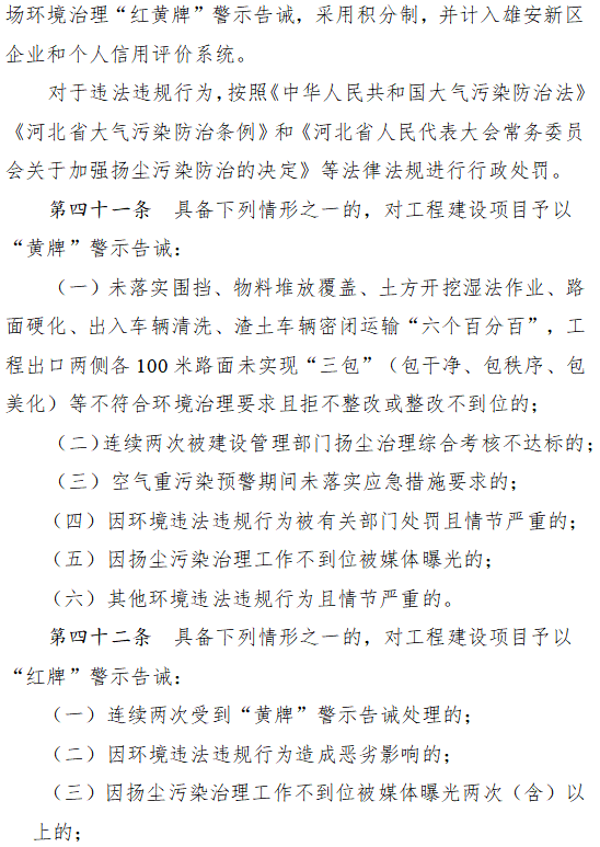 根據《辦法》,在技術手段上,對施工現場全覆蓋和紅外監控,24小時采集PM2.5、PM10數據;在節能環保方面,提倡使用新型生態、節能、環保產品,宜優先選用成套裝配式產品,必須使用具有定位功能的全封閉環保型新能源專用運輸車輛,必須使用符合國家及地方排放標準或電動等新能源的非道路移動機械;實行建設工程施工現場環境治理“紅黃牌”警示告誡,采用積分制,并計入雄安新區企業和個人信用評價系統;在處罰力度上,12個月之內兩次“紅牌”警告的,施工單位和監理單位納入雄安新區黑名單,列入黑名單的從業單位和從業人員停止參與雄安新區的建筑市場投標資格。