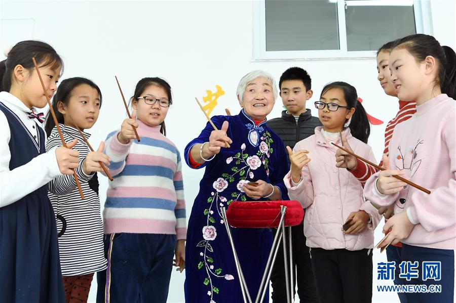 1月30日,樂亭大鼓藝人肖云霞(中)在樂亭縣青少年校外活動中心向?qū)W生們傳授樂亭大鼓表演技藝。寒假期間,河北省樂亭縣青少年校外活動中心組織開展“傳統(tǒng)文化扮靚寒假生活”系列公益活動,通過開設書法、民族舞蹈、茶藝等特色培訓班,豐富孩子們的寒假生活,推動傳統(tǒng)文化傳承。新華社記者 牟宇 攝