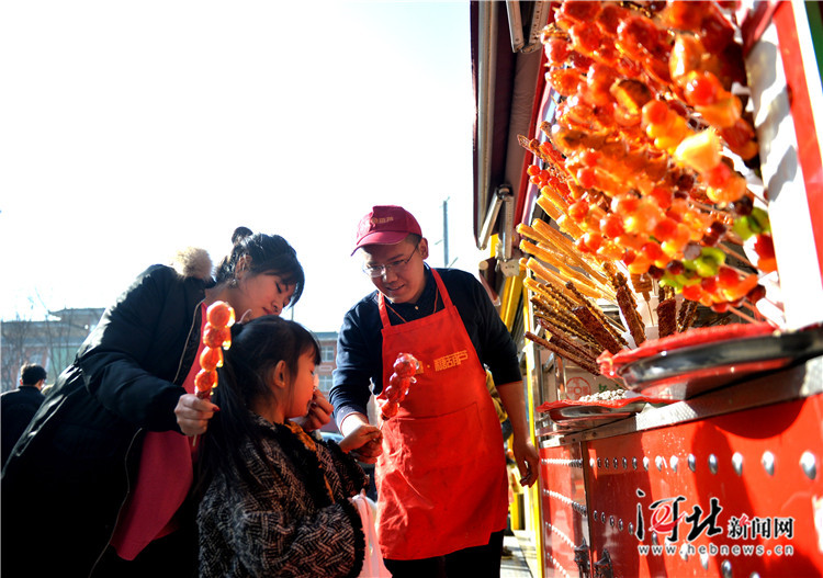 2月1日,雄縣大樹劉莊村村民董向南在縣城天奕商廈門口一處攤位前售賣糖葫蘆。記者陳建宇攝