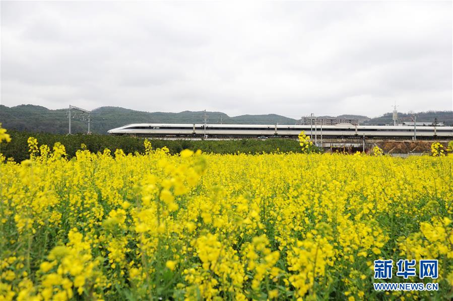 2月23日,一列列車在貴廣高鐵貴州從江段行駛。早春時(shí)節(jié),貴州省黔東南苗族侗族自治州境內(nèi)的油菜花陸續(xù)盛開,列車穿行其間,美不勝收。新華社記者 楊文斌 攝