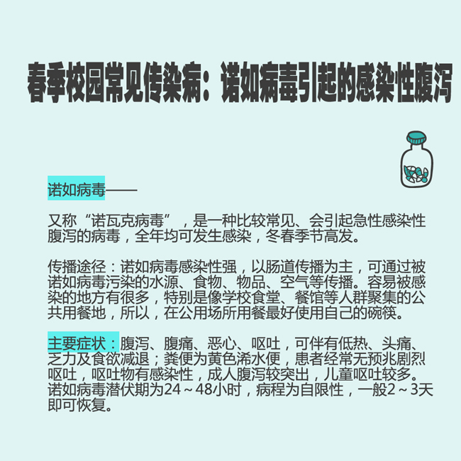1.預防接種:接種疫苗是最有效、最經濟的預防措施,上述6種疾病中,除了諾如病毒引起的感染性腹瀉無針對性疫苗外,其余均有疫苗可以接種預防。