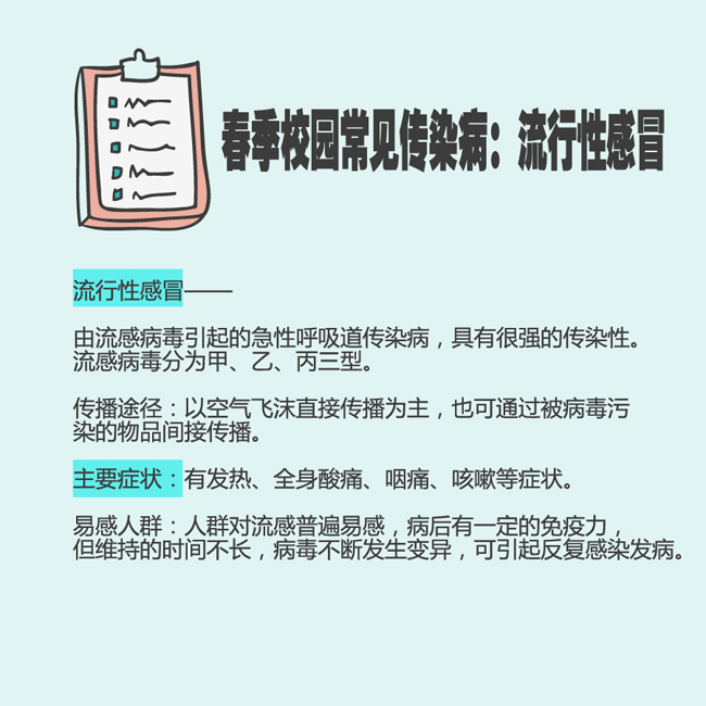 春季天氣多變、時暖時寒,學校和托幼機構要謹防流感、水痘等春季傳染病的擴散。