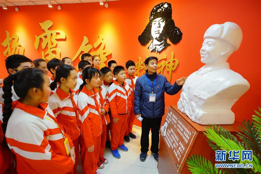 3月5日,河北省唐山市古冶區(qū)雷鋒精神紀(jì)念館義務(wù)講解員段思序(右一)為前來參觀的小學(xué)生們講述雷鋒事跡。