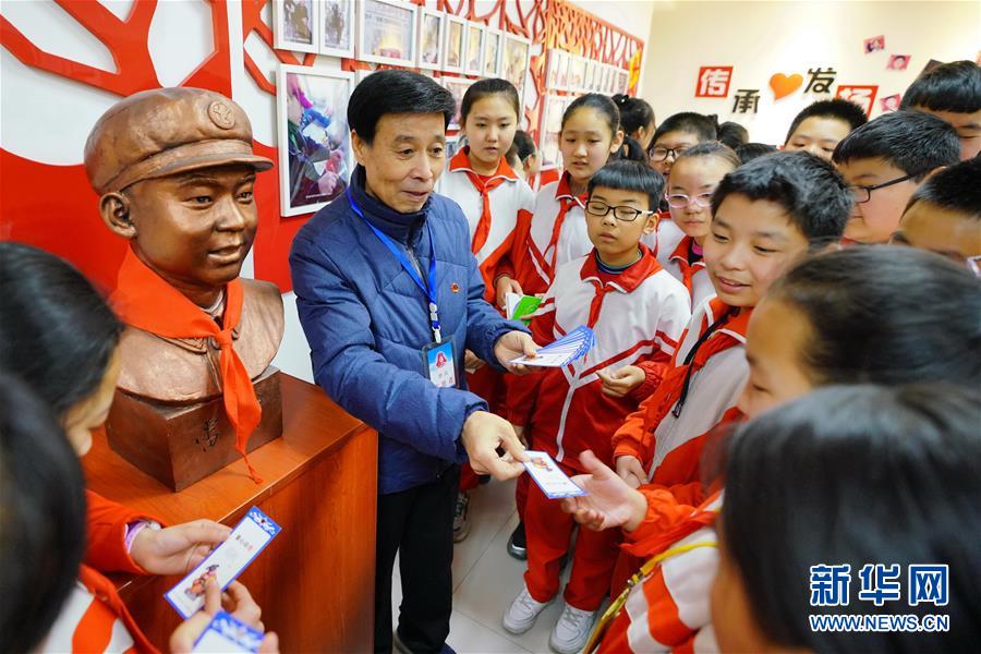 3月5日,河北省唐山市古冶區雷鋒精神紀念館義務講解員段思序(左一)向學生發放學雷鋒紀念卡。