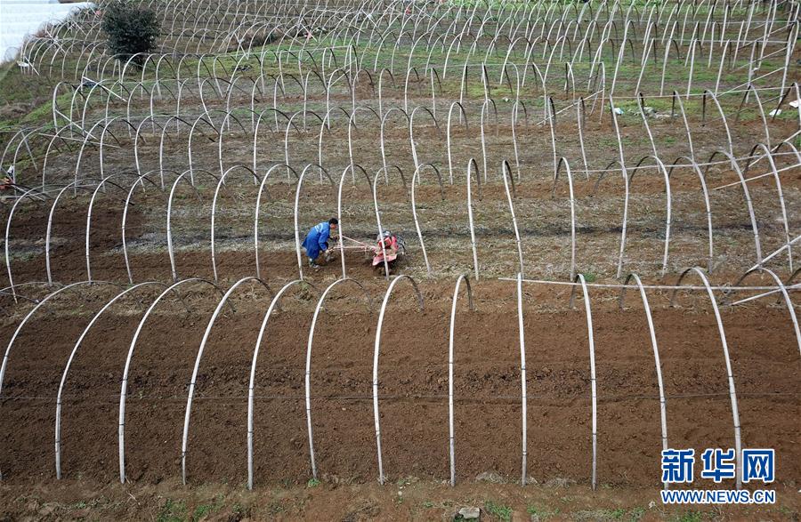 3月6日,貴州省丹寨縣興仁鎮甲腳村村民在犁地(無人機拍攝)。當日是二十四節氣中的驚蟄,隨著氣溫回升,各地農民忙著春耕春管,田間地頭到處是一派忙碌景象。新華社發(黃曉海 攝)