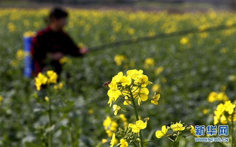 3月6日,江西省靖安縣仁首鎮石下村農民在油菜花田里噴藥。當日是二十四節氣中的驚蟄,隨著氣溫回升,各地農民忙著春耕春管,田間地頭到處是一派忙碌景象。新華社發(徐仲庭 攝)