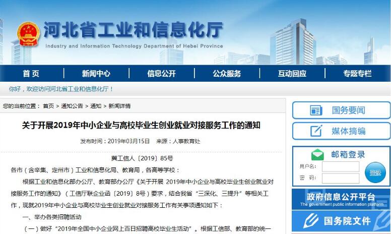 日前,河北省工信廳和省教育廳聯合印發《關于開展2019年中小企業與高校畢業生創業就業對接服務工作的通知》提出,河北省工信廳、省教育廳自即日起至6月8日,聯合舉辦2019年全國中小企業“百日招聘”河北專場活動。