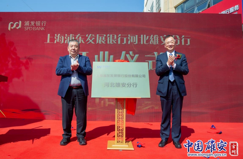 河北雄安新區黨工委委員、管委會副主任劉樹軍,上海浦東發展銀行黨委副書記、行長潘衛東共同為上海浦東發展銀行河北雄安分行揭牌。中國雄安官網發