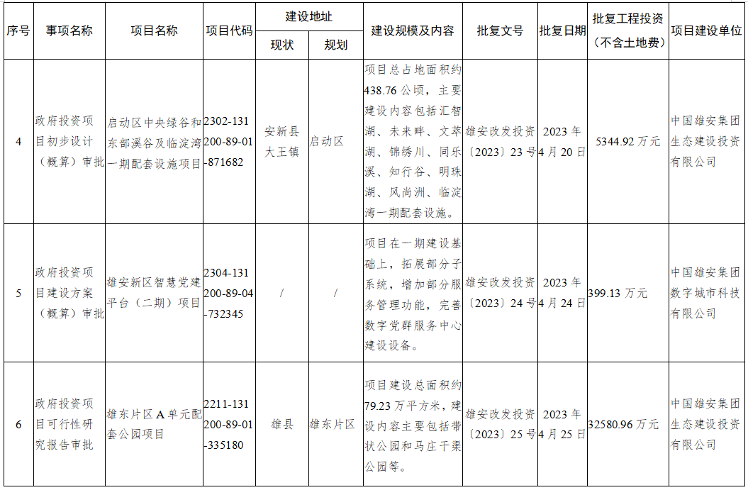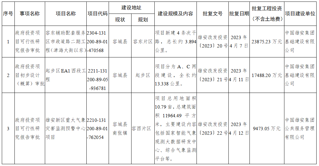 雄安新區政府投資項目審批結果公示(2023年4月份)