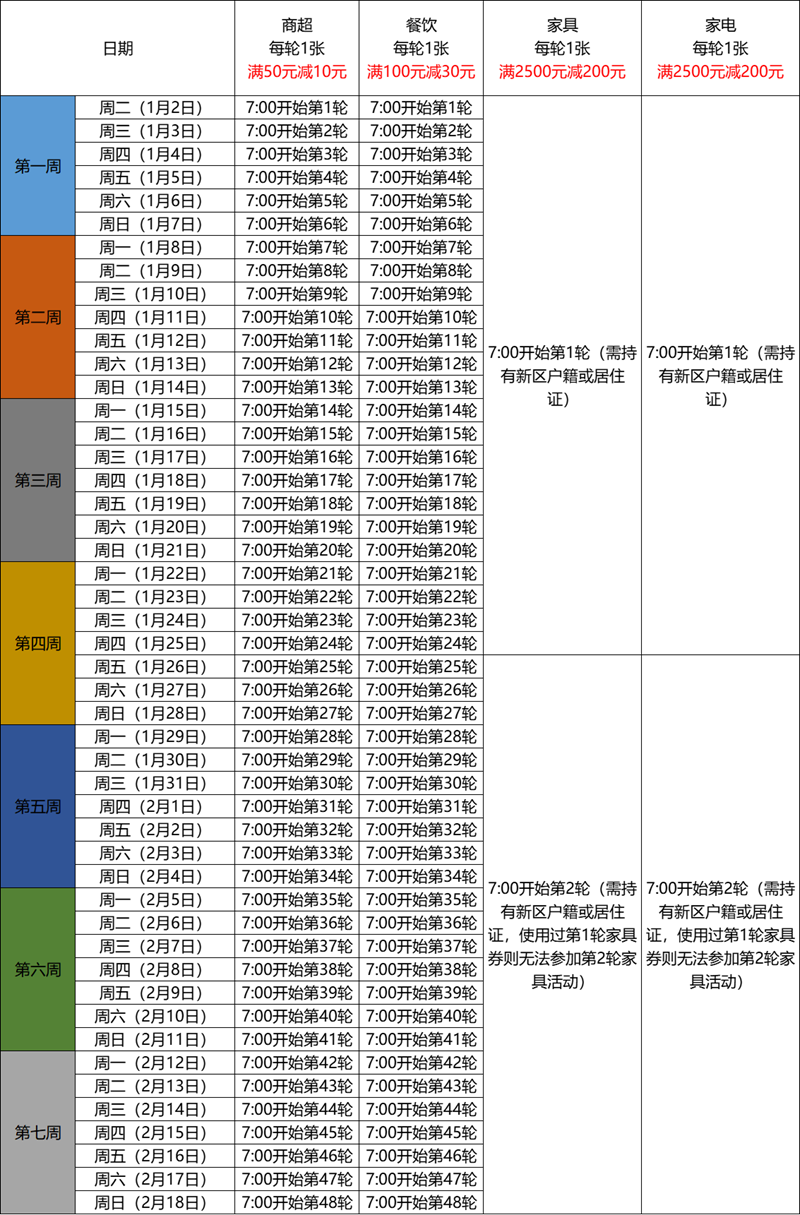面額為滿2500元減200元,共開展2輪。第一輪搶券和用券時間為1月2日7:00至1月25日23:59,第二輪搶券和用券時間為1月26日7:00至2月18日23:59。每個符合條件的用戶可在2輪活動中任選1輪參加,一旦在第1輪成功領取并使用了家具券,則不可在第2輪領取家具券,如未在第1輪領取或在第1輪領取但未使用任何一張家具券,則仍可在第2輪領取并使用家具券。