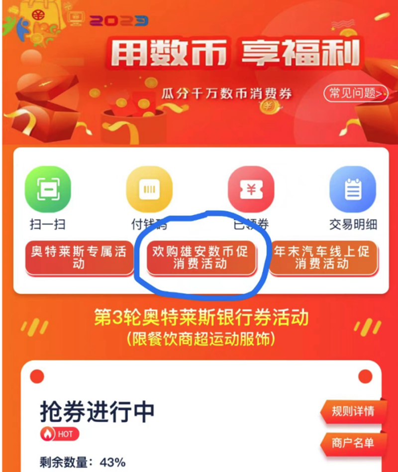 請注意,由于目前同時在舉行奧特萊斯促消費活動,需要您點擊雄安新消費APP頂部“歡購雄安數幣促消費活動”按鈕后快速移動至歡購雄安消費券專區,如下圖所示: