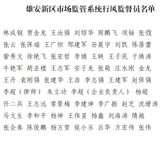 根據(jù)《河北雄安新區(qū)管理委員會綜合執(zhí)法局關(guān)于選聘雄安新區(qū)市場監(jiān)管系統(tǒng)行風(fēng)監(jiān)督員的公告》及有關(guān)要求,按照初步審查、組織考察等選聘程序,初步完成了行風(fēng)監(jiān)督員的選聘工作,現(xiàn)對擬聘人選(名單附后)予以公示,公示日期:2024年1月8日至2024年1月12日(5個工作日)。