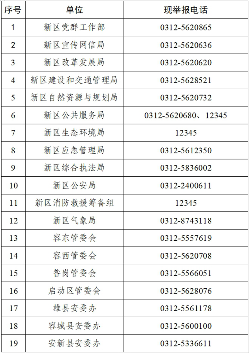 為認真貫徹落實《中華人民共和國安全生產法》《河北省安全生產條例》和《河北省安全生產舉報和獎勵辦法(試行)》等法律法規和文件規定,鼓勵企業內部員工和廣大群眾舉報安全生產事故隱患和非法違法行為,進一步加強安全生產領域社會監督,及時治理和消除各類安全隱患,現將雄安新區各單位的安全生產舉報電話公示如下: