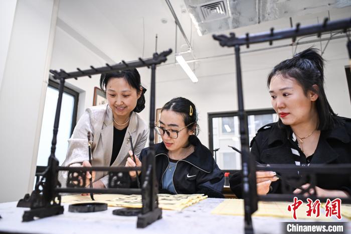 图为雄安东西里社区,书法老师正在指导社区青年练习书法。王伟倩 摄