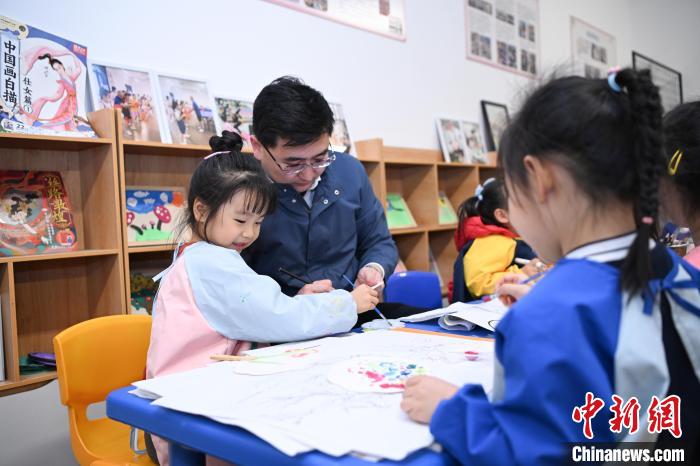 图为雄安东西里社区工作人员正在教小朋友画画。王伟倩 摄