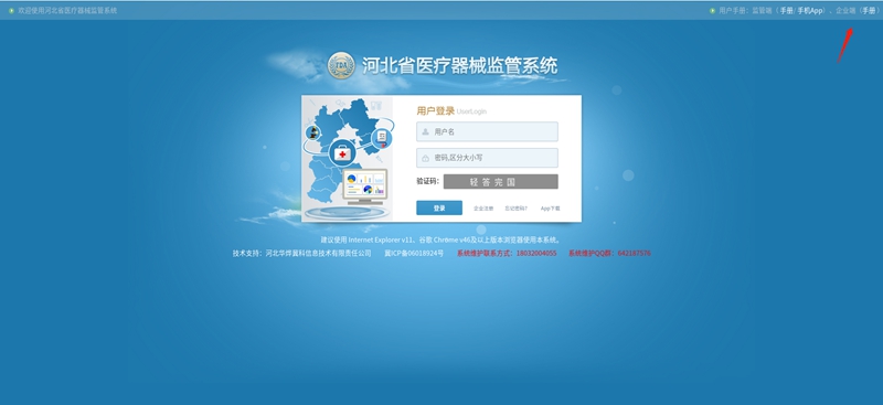 进入“河北省医疗器械监管系统”,用户名:统一社会信用代码,若忘记密码请点击登录界面右上角下载企业端手册,查看密码找回途径。