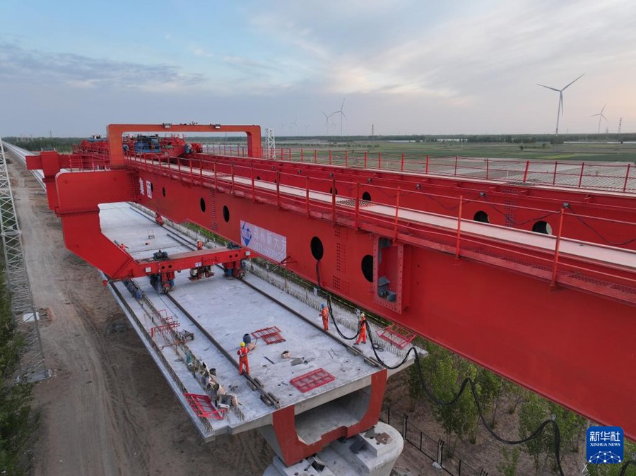 4月27日,中铁二十局集团工人在雄商高铁河北段最后一孔箱梁架设现场作业。新华社记者牟宇 摄