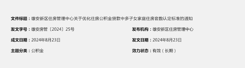 根据河北省住房和城乡建设厅、中国人民银行河北省分行、国家金融监督管理总局河北监管局联合印发《关于优化多子女家庭住房套数认定标准的通知》(冀房建市〔2024〕5号)文件精神,为更好支持多子女家庭合理住房需求,经新区党工委、管委会批准,现就住房公积金贷款中多子女家庭住房套数认定标准有关事项通知如下: