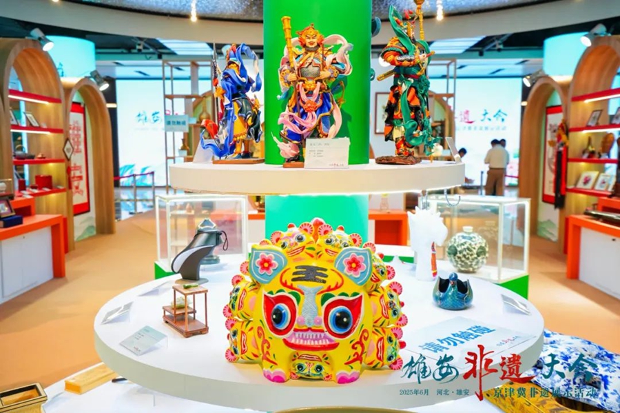 在雄安商务服务中心地下环廊,琳琅满目的京津冀非遗精品区,共汇聚了三地200余件具有代表性且与现代生活融合紧密的传统技艺、传统美术类非遗精美作品。漫步其间,技艺精湛的北京玲珑枕、色彩华美的津派周氏风筝、精美的定兴京绣……一件件巧夺天工的艺术品,让游客爱不释手,营造出非遗保护成果共享的和谐氛围。
