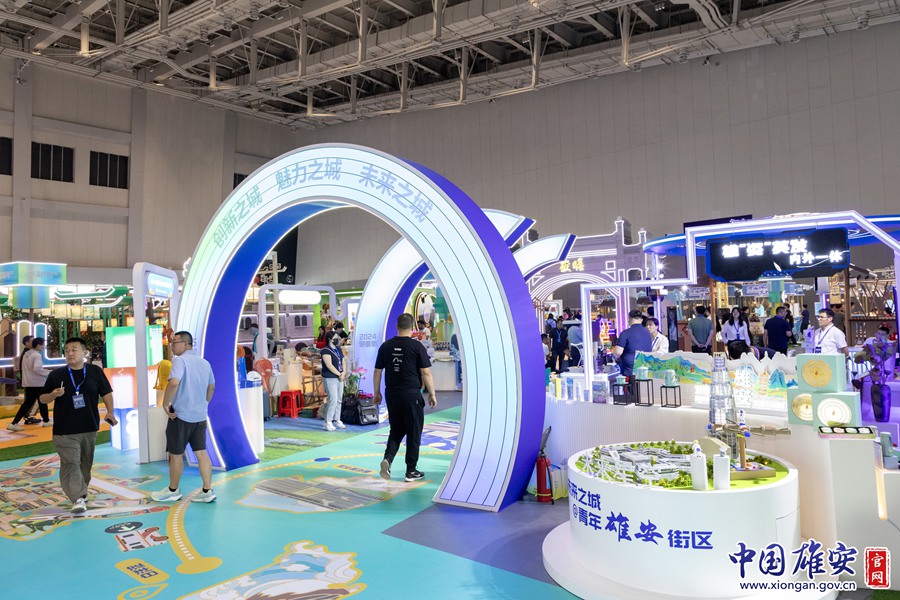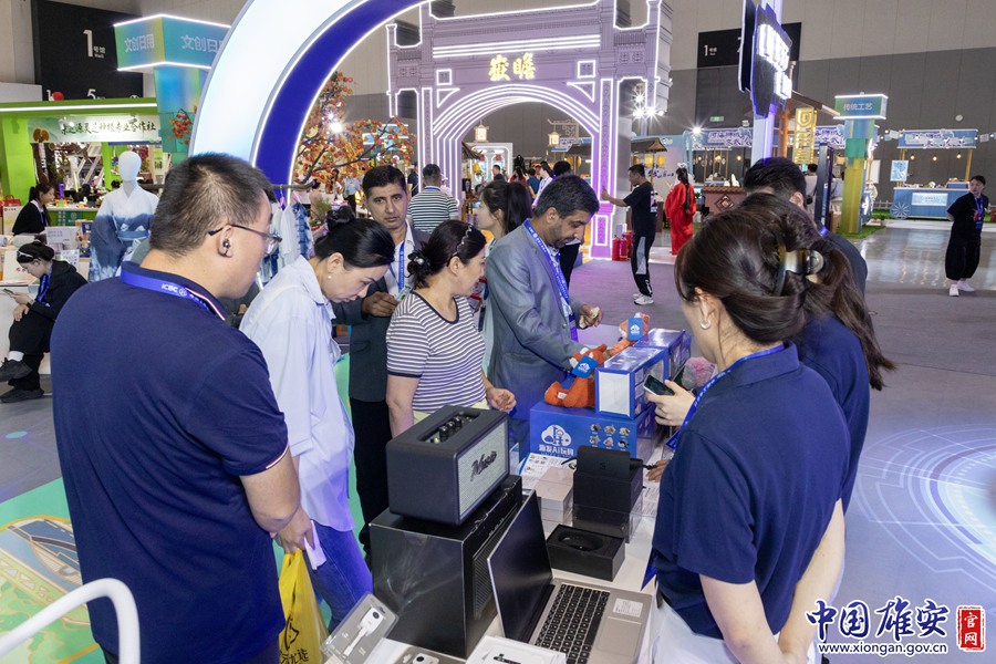 “雄‘姿’英发,内外一体”档口用青春化的设计讲述雄安文化基因,重点呈现雄安新区“魅力之城”与文创活力的水乳交融。“雄安青瓷器”、白洋淀鸟类冰箱贴等文创产品和跨境商品展销区的优质全球好物受到参展观众的青睐。