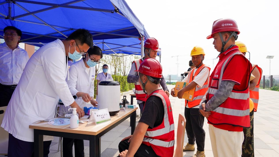 在送健康行动中,联合雄安宣武医院和社区卫生服务中心进行现场义诊,开展内科、外科、中医科等常规检查,提供健康建议和防暑咨询。同时为项目部、工地及工人生活区提供消暑饮品,配备急救药箱。设置“心理倾诉角”,党员心理咨询师普及心理健康知识,提供暖心服务。