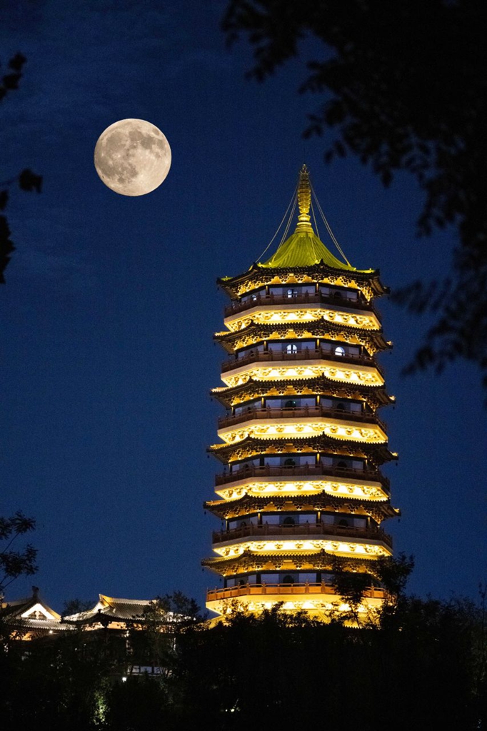 10月6日,农历八月十五,中秋佳节。当晚,雄安新区上空升起“超级月亮”。夜幕下,雄安体育中心、悦容公园安和塔、金湖公园定安阁等地标建筑与圆月同框,呈现出一幅美轮美奂的中秋画卷。